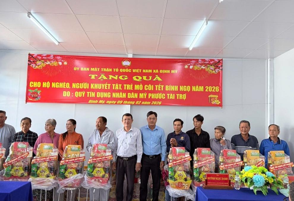 Chiều ngày 09/02/2026, Ủy ban Mặt trận Tổ quốc Việt Nam xã Định Mỹ phối hợp cùng Quỹ Tín dụng Mỹ Phước tổ chức chương trình trao tặng 50 phần quà Tết cho các hộ gia đình có hoàn cảnh khó khăn trên địa bàn xã, nhân dịp Tết Nguyên đán Bính Ngọ năm 2026. Tham dự chương trình có ông Huỳnh Ngọc Danh, Phó Chủ tịch UBND xã Định Mỹ; ông Nguyễn Hoàng Năng, Chủ tịch Ủy ban MTTQ Việt Nam xã; ông Nguyễn Hiền Sĩ, Chủ tịch Hội đồng Quản trị Quỹ Tín dụng Mỹ Phước, cùng đại diện các ban, ngành, đoàn thể địa phương.