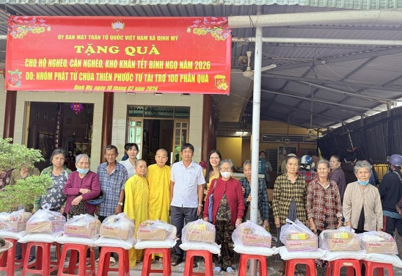 Sáng ngày 10/02/2026, Ủy ban Mặt trận Tổ quốc Việt Nam xã Định Mỹ phối hợp với Nhóm Phật tử chùa Thiên Phước Tự tổ chức trao 100 phần quà cho các hộ gia đình có hoàn cảnh khó khăn trên địa bàn xã. Tham dự buổi trao quà có ông Nguyễn Hoàng Năng, Chủ tịch Ủy ban MTTQ Việt Nam xã; Sư cô Thích nữ Tạng Liên, Trụ trì chùa Thiên Phước Tự, cùng các thành viên Ủy ban MTTQ Việt Nam xã.