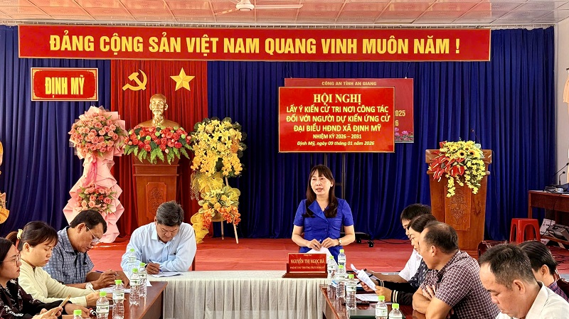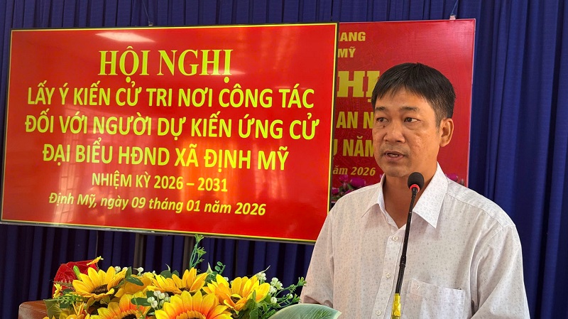 Thực hiện Luật Bầu cử đại biểu Quốc hội và đại biểu Hội đồng nhân dân các cấp; các văn bản hướng dẫn của Trung ương và kế hoạch của Ủy ban bầu cử xã, sáng ngày 09/01/2026, Đảng ủy, HĐND, UBND và Ủy ban MTTQ Việt Nam xã Định Mỹ tổ chức Hội nghị lấy ý kiến cử tri nơi công tác đối với người được dự kiến giới thiệu ứng cử đại biểu HĐND xã Định Mỹ, nhiệm kỳ 2026 - 2031. Hội nghị do bà Nguyễn Thị Ngọc Hà - Phó Bí thư Thường trực Đảng ủy xã Định Mỹ chủ trì.