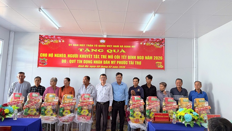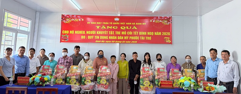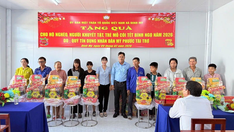 Chiều ngày 09/02/2026, Ủy ban Mặt trận Tổ quốc Việt Nam xã Định Mỹ phối hợp cùng Quỹ Tín dụng Mỹ Phước tổ chức chương trình trao tặng 50 phần quà Tết cho các hộ gia đình có hoàn cảnh khó khăn trên địa bàn xã, nhân dịp Tết Nguyên đán Bính Ngọ năm 2026. Tham dự chương trình có ông Huỳnh Ngọc Danh, Phó Chủ tịch UBND xã Định Mỹ; ông Nguyễn Hoàng Năng, Chủ tịch Ủy ban MTTQ Việt Nam xã; ông Nguyễn Hiền Sĩ, Chủ tịch Hội đồng Quản trị Quỹ Tín dụng Mỹ Phước, cùng đại diện các ban, ngành, đoàn thể địa phương.