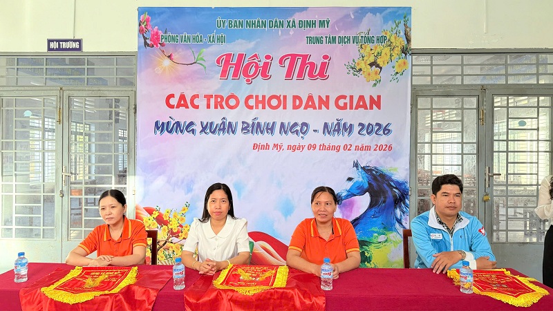 Sáng ngày 09/02/2026, tại Trung tâm Học tập cộng đồng xã Định Mỹ (cũ), Trung tâm Dịch vụ tổng hợp xã phối hợp với Phòng Văn hóa, Xã hội tổ chức Hội thi các trò chơi dân gian mừng Xuân Bính Ngọ năm 2026. Đến dự hội thi có bà Phạm Thị Ngọc Cứ, Phó Trưởng phòng Văn hóa - Xã hội; bà Đoàn Mỹ Hạnh, Viên chức quản lý Trung tâm Dịch vụ tổng hợp xã, cùng đông đảo vận động viên đến từ 15 đội thi đại diện cho 15 ấp trên địa bàn xã.