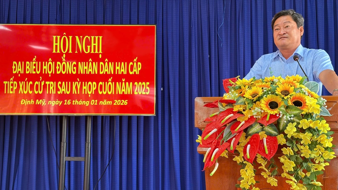 Sáng ngày 16/01/2026, Ban Thường trực Ủy ban Mặt trận Tổ quốc Việt Nam xã Định Mỹ phối hợp với Thường trực HĐND và UBND xã tổ chức Hội nghị tiếp xúc cử tri với đại biểu HĐND hai cấp tỉnh và xã sau kỳ họp cuối năm 2025. Tham dự hội nghị có bà Nguyễn Thị Liêm – Phó Bí thư Đảng ủy UBND tỉnh An Giang; ông Lê Hiền Hòa – Phó Bí thư Đảng ủy, Chủ tịch UBND xã Định Mỹ; bà Dương Triết Minh – Ủy viên Ban Thường vụ Đảng ủy, Phó Chủ tịch HĐND xã. Cùng dự còn có đại diện lãnh đạo HĐND, UBND, các ban, ngành, đoàn thể xã và hơn 100 cử tri đại diện các ấp trên địa bàn xã.