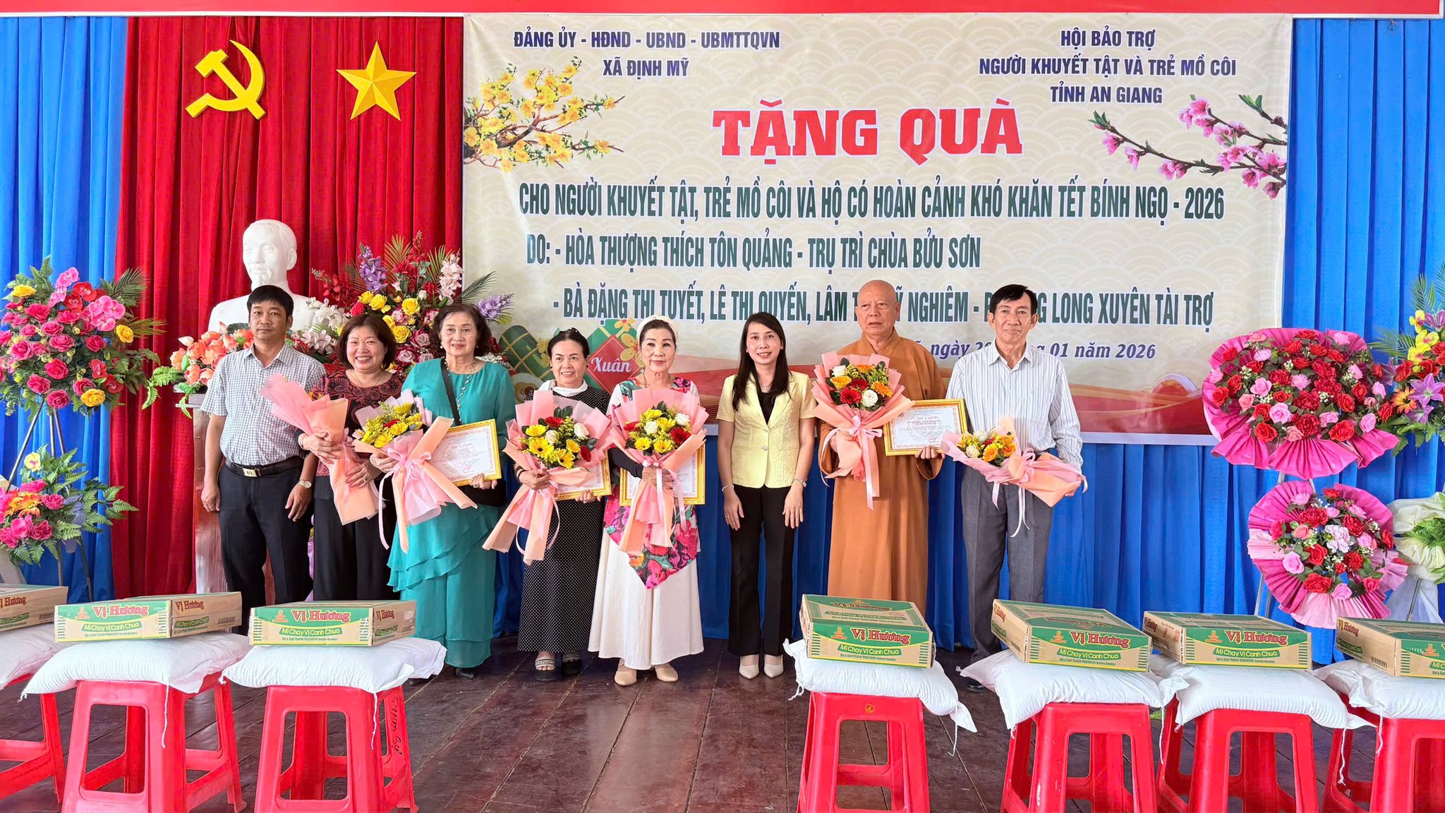 Tham dự buổi trao quà có ông Trương Minh Thuần – Chủ tịch Hội Bảo trợ người khuyết tật và trẻ mồ côi tỉnh An Giang; bà Nguyễn Thị Ngọc Hà – Phó Bí thư Thường trực Đảng ủy xã Định Mỹ; ông Nguyễn Hoàng Năng – Chủ tịch Ủy ban MTTQ Việt Nam xã, cùng đại diện các nhà hảo tâm và đông đảo bà con nhân dân địa phương.