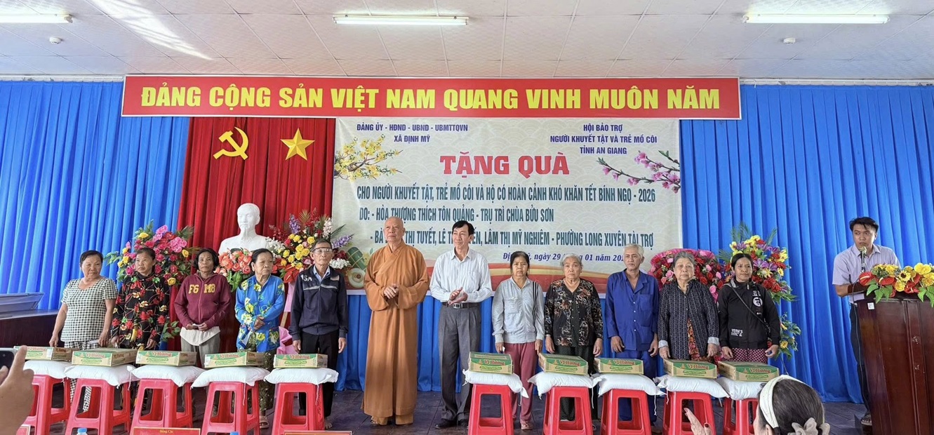 Sáng ngày 29/01/2026, Ủy ban MTTQ Việt Nam xã Định Mỹ phối hợp với Hội Bảo trợ người khuyết tật và trẻ mồ côi tỉnh An Giang cùng các nhà hảo tâm tổ chức trao tặng 200 phần quà Tết cho người khuyết tật, trẻ mồ côi và các hộ gia đình có hoàn cảnh khó khăn trên địa bàn xã, nhân dịp Tết Nguyên đán Bính Ngọ 2026.