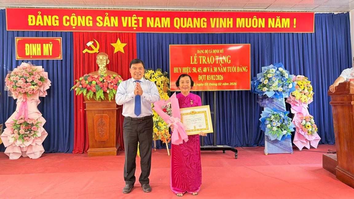 Tại buổi lễ, Ban Thường vụ Đảng ủy xã đã công bố Quyết định của Ban Thường vụ Tỉnh ủy về việc trao tặng Huy hiệu Đảng đợt ngày 03/02/2026. Theo đó, Đảng bộ xã Định Mỹ có 05 đồng chí vinh dự được trao tặng Huy hiệu Đảng, gồm: 01 đồng chí nhận Huy hiệu 50 năm tuổi Đảng; 02 đồng chí nhận Huy hiệu 45 năm tuổi Đảng; 01 đồng chí nhận Huy hiệu 40 năm tuổi Đảng và 01 đồng chí nhận Huy hiệu 30 năm tuổi Đảng.